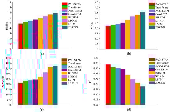 Table 7 presents the experimental results. It can be observed that the proposed PAG-STAN model achieves the best prediction performance, followed by the Transformer model. The RMSE of PAG-STAN is 4.8927, which is 6.19% lower than that of Transformer. Its MAE is 2.1878, 6.59% lower than Transformer’s MAE. Its WMAPE is 21.39%, 8.20% lower than Transformer’s. Last, its R2 reaches 0.9755, which is 1.13% higher than Transformer’s. Furthermore, to validate the necessity of the core components within the PAG-STAN framework, we specifically benchmarked AGC-LSTM and BiLSTM as standalone models. As shown in Table 7, the prediction performance of the isolated AGC-LSTM model and the isolated BiLSTM model is weaker than that of the integrated PAG-STAN framework. The performance gap clearly demonstrates the necessity and effectiveness of integrating AGC-LSTM, BiLSTM, and the multi-head attention mechanism, thereby indirectly confirming that each designed module plays a crucial role in improving the prediction accuracy of PAG-STAN.