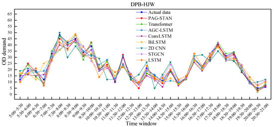 Figure 14 illustrates the comparison between actual and predicted OD demand for each model on 9 September 2024, from Duanping Bridge Stop to Huanghai Road & Jianghai Avenue West Stop. Actual values are marked with squares, while predicted values of the proposed model are marked with circles. As shown in Figure 14, compared to other methods, the PAG-STAN model more accurately captures the peaks and troughs of OD demand fluctuations throughout the day. The following specific conclusions can be obtained.