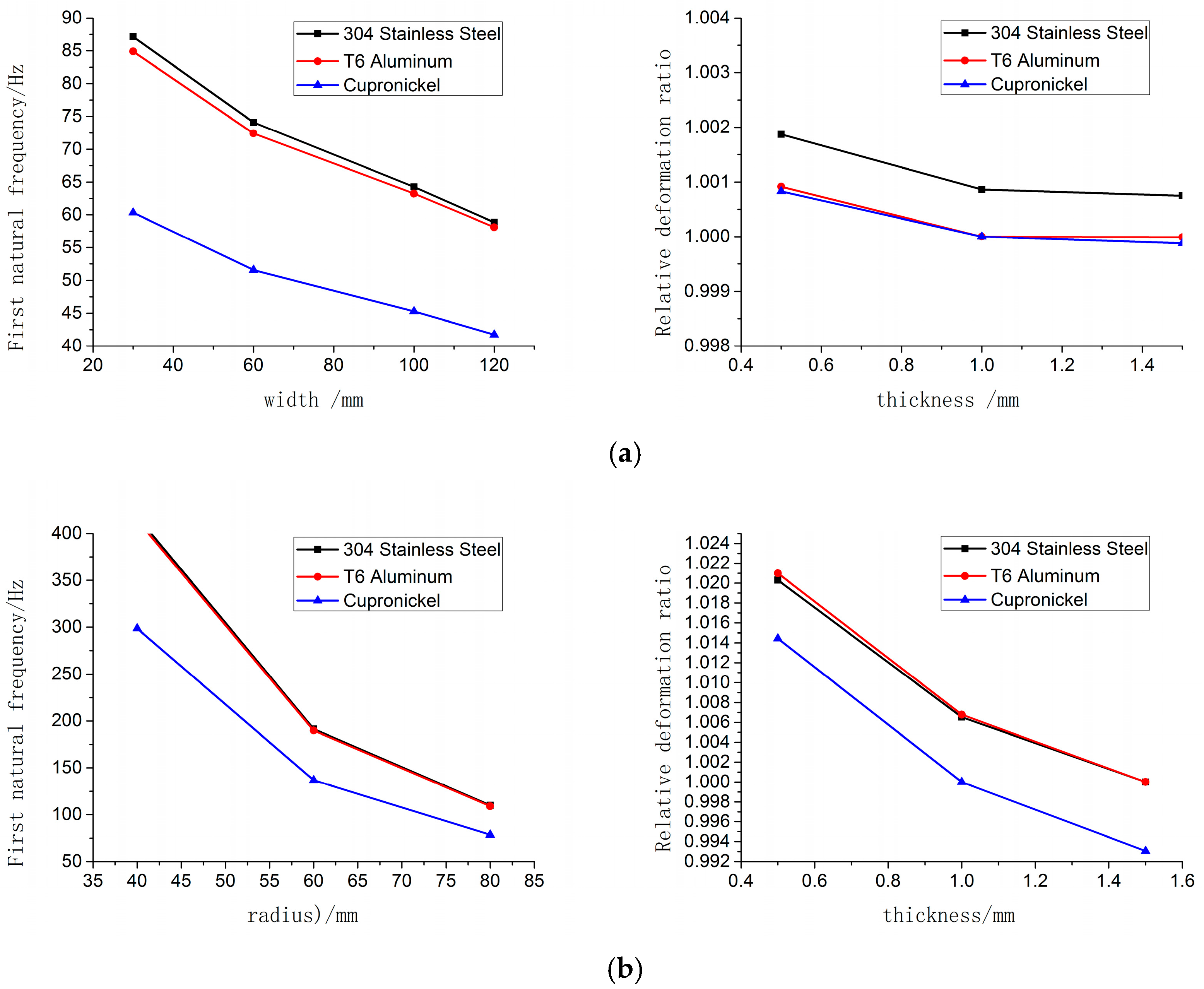 For circular plates: When the thickness exceeded 1 mm, the first-order natural frequency increased, while the relative deformation rate decreased significantly. When the radius exceeded 60 mm, the first-order natural frequency decreased, whereas the relative deformation rate increased. The parameter range yielding optimal performance was determined as radius = 40–70 mm, thickness = 0.5–1.0 mm.