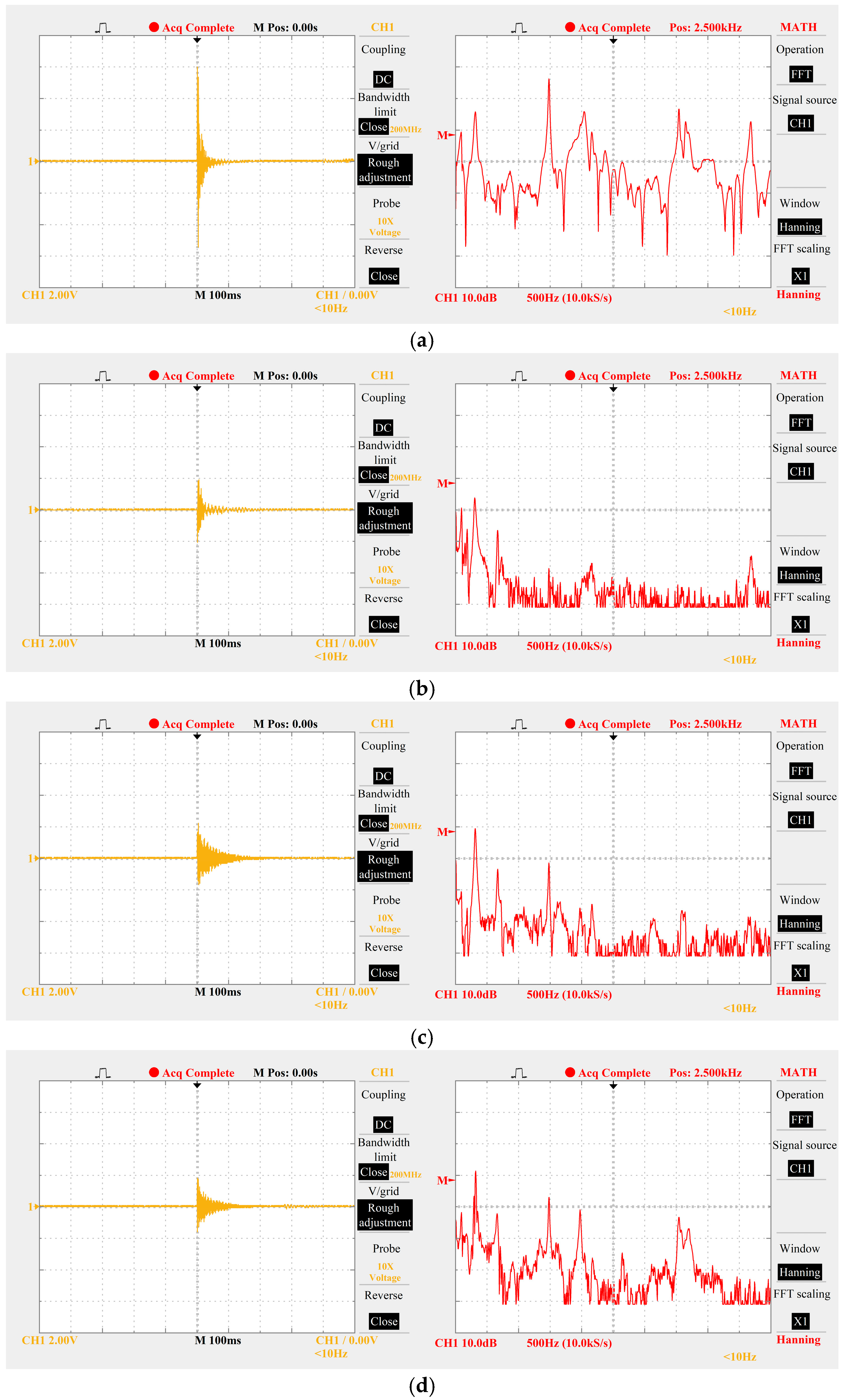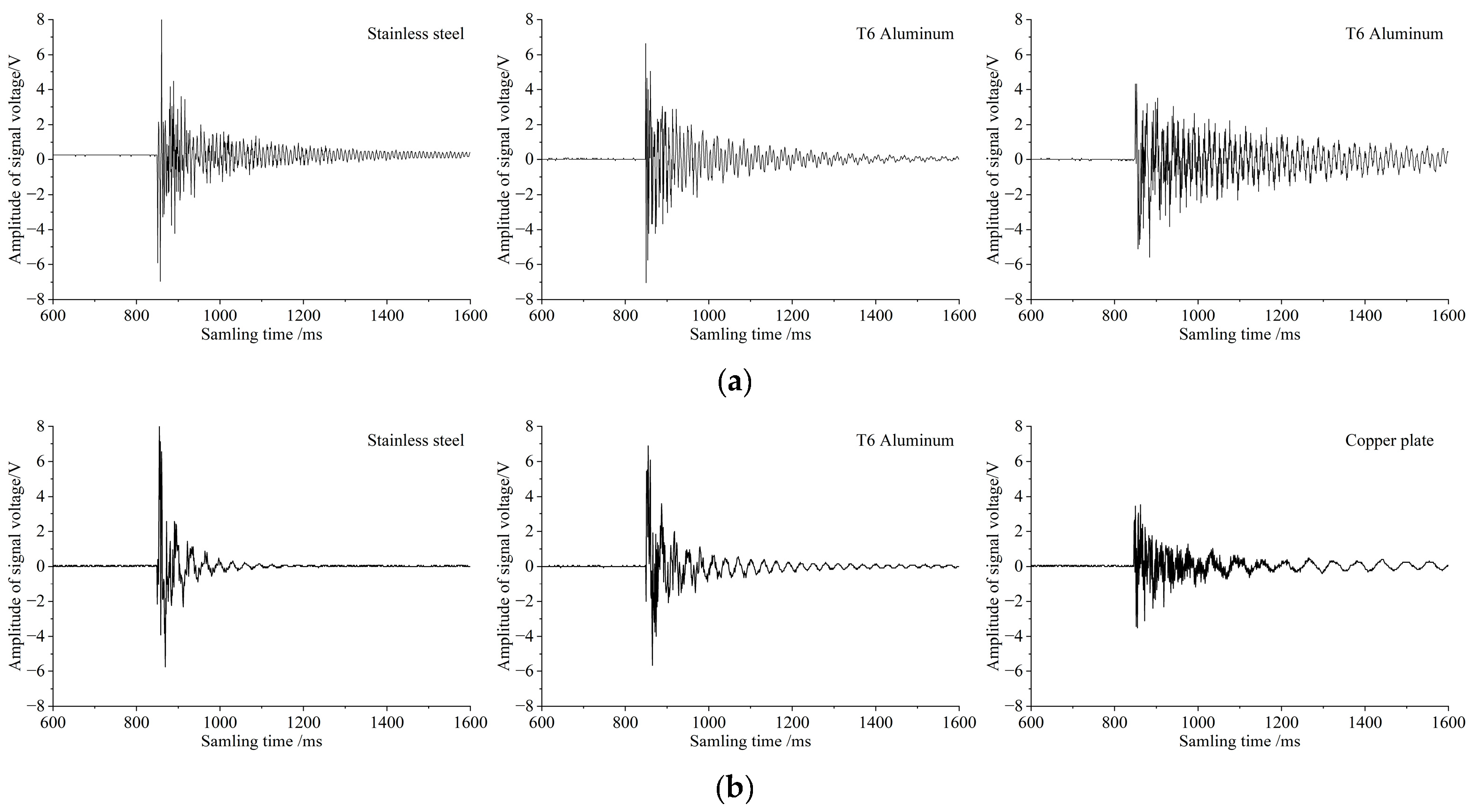 For rectangular plates: The 304 stainless steel plate exhibited the highest first-order natural frequency and the shortest signal decay time, while the cupronickel plate showed the lowest first-order natural frequency and a significantly longer signal decay time. Regarding voltage amplitude, the 304 stainless steel plate produced the highest output—attributed to its maximum relative deformation rate—followed by the T6 aluminum plate and the cupronickel plate in sequence.