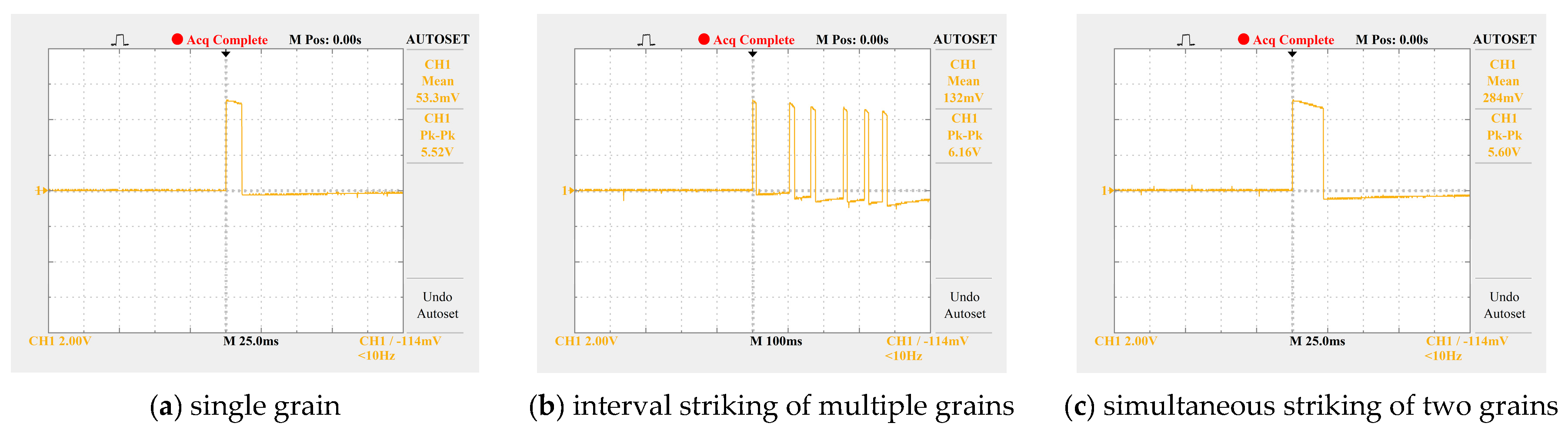 1 mm) and circular plates (radius (R) = 60 mm, thickness = 1 mm). Sensor signals were processed by a conditioning circuit (comprising a charge amplifier, a filter, and a voltage comparator) and then recorded using an oscilloscope. During testing, a single soybean grain (consistent across tests) was released to fall freely from a height of 20 cm directly above the center of the sensitive plate, ensuring consistency in collision position and excitation energy. The output signal waveforms are presented in