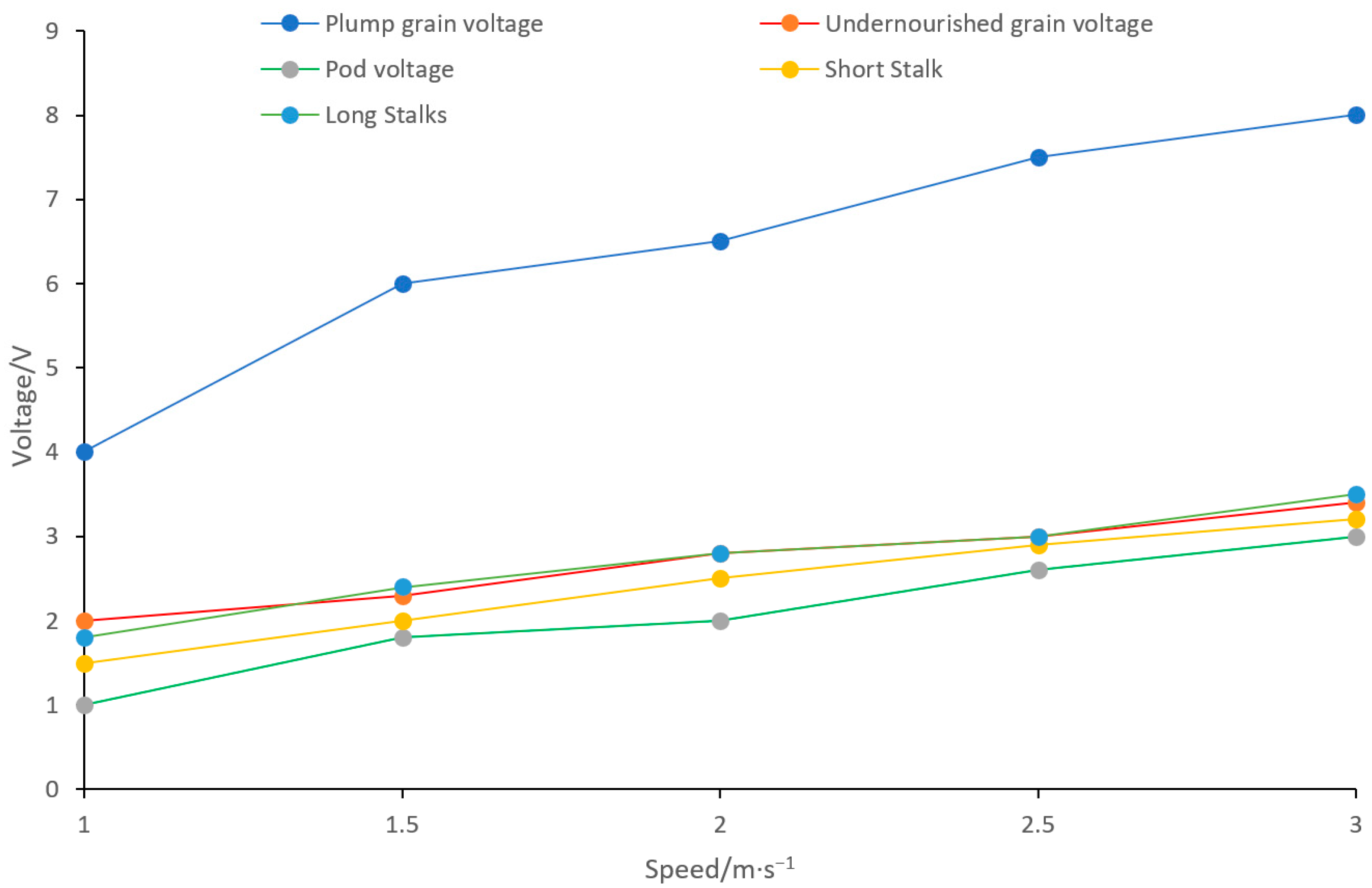 The signal processing strategy based on FFT (Fast Fourier Transform) spectrum analysis (1.0–3.0 kHz band-pass filtering) and a 3.5 V voltage threshold can effectively distinguish between grain and impurity signals. Combined with the counting algorithm based on high-level duration, this strategy solves the counting error problems caused by multi-grain collision and secondary rebound.