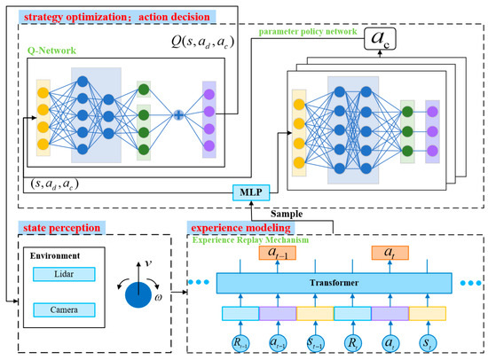 In recent years, Deep Reinforcement Learning (DRL) [9] has achieved remarkable breakthroughs in diverse fields such as autonomous driving, robotic control, and gameplay. By enabling agents to interact with their environments, DRL allows systems to adapt to dynamic and uncertain conditions by continuously updating their policies to maximize cumulative rewards. During training, DRL commonly incorporates an experience replay mechanism, which buffers the trajectories generated by interaction and randomly samples them to construct training samples [10]. This process helps to eliminate temporal correlations among samples and stabilizes policy updates. However, in dynamic environments, conventional experience replay mechanisms often disrupt the temporal structure of state sequences. This disruption can dilute or overlook critical states, such as obstacle-avoidance turning points and path reconstruction, which are essential for adapting to environmental changes. As a result, mobile robots may struggle to capture high-value experiences effectively, thereby reducing their responsiveness and adaptability. Furthermore, many navigation tasks require the simultaneous handling of high-level discrete decision-making and low-level continuous control to ensure path continuity. Traditional DRL approaches, which rely exclusively on either discrete or continuous action spaces, are inadequate for modeling such hybrid decision-making demands. To address this challenge, the Parameterized Action Space (PAS) [11] framework was proposed, with the Parameterized Deep Q-Network (PDQN) [12] being its most representative algorithm. PDQN integrates a Q-network for discrete action selection with a policy network for continuous parameter generation. This design provides significantly stronger representational capacity than traditional methods and has been widely adopted. However, PDQN still suffers from an important limitation: its parameter policy network employs a single shared architecture for all discrete actions and does not account for semantic differences between them. This shared structure is prone to gradient interference and semantic conflicts during training, which reduces the accuracy of continuous parameter generation. These issues are particularly pronounced in tasks characterized by strong environmental dynamics.