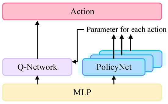 Therefore, Hausknecht and Stone [22] first introduced the concept of parameterized action space through the Parameterized Action DQN (PADQN), which combined Q-learning for discrete action selection with a parametric policy network for continuous control. Building on this idea, Xiong et al. [12] proposed the P-DQN (commonly referred to as PDQN), which further integrates the principles of DDPG and DQN. Their method allows direct optimization in the parameter space and significantly enhances training efficiency. Following this development, researchers proposed several improved algorithms to overcome the limitations of PDQN. For instance, Tavakoli et al. [23] introduced the Action-Parameterized Q-Network (APQN), which further enhanced the representation of hybrid action spaces and laid the groundwork for later structural optimizations.