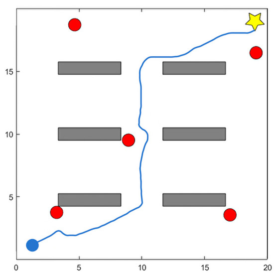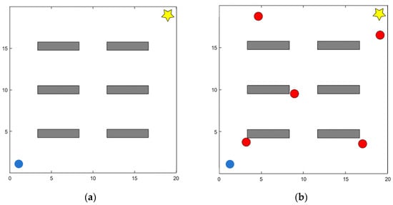 All experiments were conducted in simulated environments. Specifically, a two-dimensional continuous space simulation was used to model the navigation and obstacle avoidance tasks. Unlike grid-based methods that discretize the environment into cells, this approach employs a continuous coordinate system to accurately represent both positions and obstacles. Such a representation better reflects real-world navigation requirements and enables the simulation of more complex spatial dynamics. As shown in Figure 4a, the setup consists of a 20 × 20 static continuous map. The initial position of the mobile robot is marked by a blue circle, the target position is represented by a five-pointed star, and static obstacles are indicated by gray rectangles. As shown in Figure 4b, the dynamic environment is constructed by introducing five dynamic obstacles that move randomly within a specified velocity range , . This modification simulates complex dynamic disturbances for testing purposes.