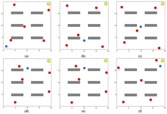Bird’s-eye view snapshots of the robot’s path planning process in the dynamic scenario: (a) the robot starts from the initial position and detects the first moving obstacle ahead; (b) the robot executes an early avoidance maneuver, adjusting its heading to the left; (c) the robot completes the avoidance and reorients toward the target; (d) the robot encounters a second dynamic obstacle moving across its path; (e) the robot performs a right-turn avoidance and path reconstruction; (f) the robot successfully reaches the target while maintaining a smooth trajectory. These sequential snapshots illustrate how the proposed DPDQN-TER policy enables time-critical obstacle detection, avoidance, and path recovery in a dynamic environment.