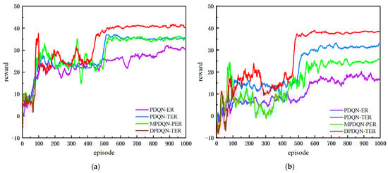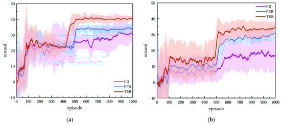 Comparison of Training Reward Curves Across Experience Replay Mechanisms: (a) Static Scenario; (b) Dynamic Scenario.