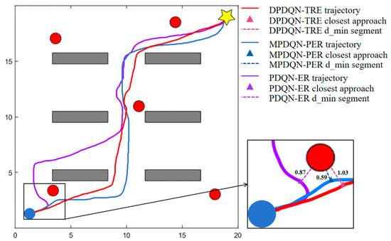 As shown in Figure 7, the training reward curves are presented for both static and dynamic settings. In the static environment, all four methods complete the path-planning task. DPDQN-TER achieves higher success rate, shorter path length, and larger average reward than others, indicating better task efficiency and policy stability. In the dynamic environment, traditional methods exhibit lower success rates and larger convergence fluctuations as obstacles move. In contrast, DPDQN-TER maintains stable convergence and higher reward levels. Table 2 provides a quantitative comparison. In the dynamic scenario, the success rate of PDQN-ER drops to 0.60 and the average path length increases to 44.48, suggesting limited adaptability to environmental changes. MPDQN-PER improves slightly but remains sensitive to local anomalies. DPDQN-TER attains a success rate of 0.92 with a shorter path, demonstrating strong effectiveness and resilience in dynamic settings. In addition, the minimum distance to obstacles attains an intermediate level under DPDQN-TER, providing sufficient clearance while avoiding unnecessary detours; this balances safety with path-length efficiency in dynamic scenes.