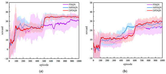 To verify the effectiveness of the improved multi-branch strategy, the proposed method (DPDQN) is compared with PDQN and MPDQN. Each method is trained five times in static and dynamic environments, with 1000 training episodes per environment. A uniform experience replay mechanism is adopted for all methods to eliminate differences due to replay. PDQN is chosen as a representative parameterized action-space method. MPDQN is included because it uses branching ideas to reduce interference among action parameters. However, the two baselines differ from DPDQN in their architectural essence and degree of decoupling.