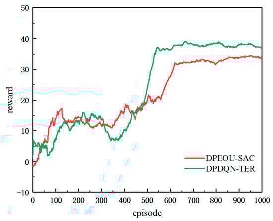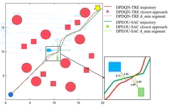 Figure 11 presents a comparison of trajectory diagrams in complex dynamic environments. The red trajectory corresponds to the DPDQN-TER method proposed in this paper, while the green trajectory represents the performance of DPEOU-SAC. Although DPEOU-SAC is able to avoid dynamic obstacle interference, DPDQN-TER reaches the target point more directly and efficiently, demonstrating superior adaptability to bidirectional moving obstacles. These results suggest that the proposed method ensures greater stability and reliability of path-planning performance when applied to novel environments.