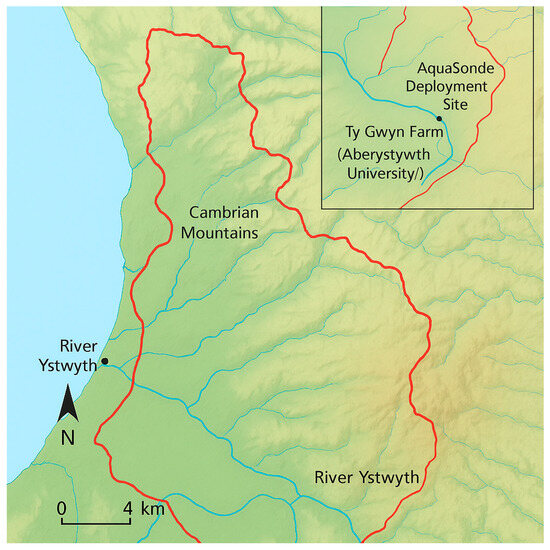 The AquaSonde was deployed for a period of two months (May to end of June) to test proof of concept. It was situated in the Ystwyth River, just downstream from the adjoining tributary Nant Pant-yr-haidd, which flows past Aberystwyth University’s Ty Gwyn farm (Figure 1). The River Ystwyth flows through varied topography within a 193 km2 catchment area, extending from the Cambrian Mountains to Cardigan Bay at Aberystwyth Harbour. Hydrographs indicate that the upper catchment is characterized by flashy hydrology, meaning flow can fluctuate both frequently and rapidly [25], and has short lag times under two and a half hours with significant seasonal variability [26]. Tributaries such as Nant Pant-yr-haidd flow through adjacent improved grasslands in the lower river valley, contributing water and potentially agricultural runoff.