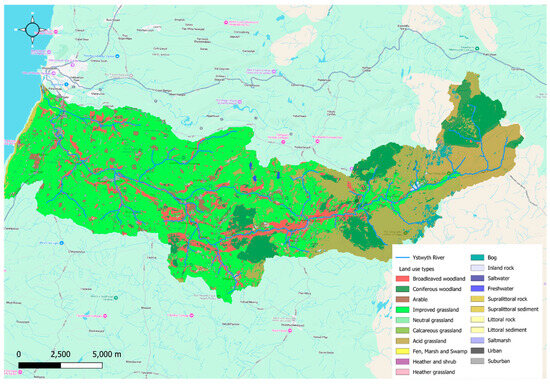 The upper river valley consists predominantly of peat bogs, unimproved grassland, and semi-improved grassland used for sheep grazing. The surrounding valley sides are covered by extensive coniferous plantations, which contribute to organic materials and may cause acidification in upstream sections [27]. In the lower valley plain, there is a mixture of livestock activities on improved grasslands (Figure 2). Here, the application of fertilizers and slurry, combined with higher stocking densities and mechanical operations like silage cultivation, may lead to nutrient loss and increased sediment loads entering the River Ystwyth and its tributaries.