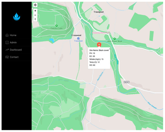 The interactive map interface within the water monitoring application, which displays water quality data from deployed sensors. Each marker corresponds to a monitoring site (the study sample site is shown here). Key water quality parameters are linked to the relevant marker.