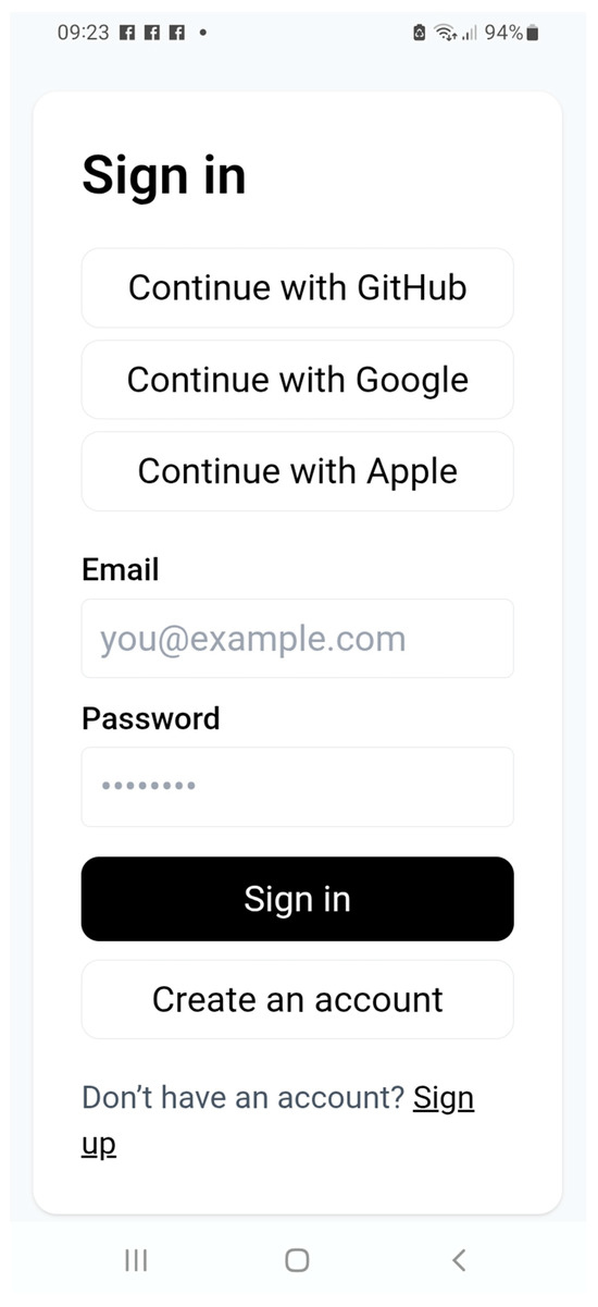 The mobile application interface appears on an Android device, illustrating the log-in page with cross-platform compatibility in a user-friendly format. Users may log in with various third-party accounts, ensuring broad accessibility to the data.