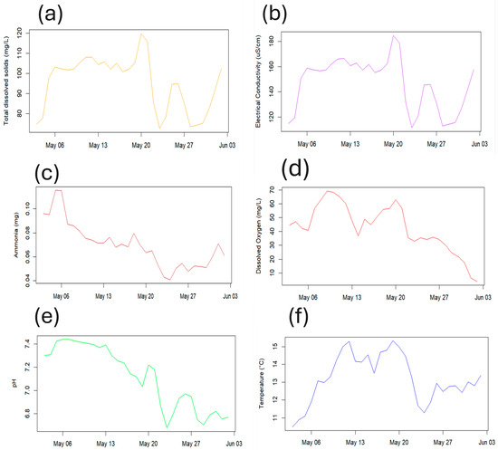 In addition to the interactive map, the application provides time-series visualizations of critical water quality parameters. Continuous monitoring of the river demonstrated the fluctuations of key water quality parameters over time (Figure 7), showing data for total dissolved solids (TDS), electrical conductivity (EC), ammonia, dissolved oxygen (DO), pH, and temperature. The TDS concentration describes the presence of inorganic salts and minor concentrations of organic substances, which demonstrates a linear relationship with the EC measurement (the capacity of the water to conduct electrical current). A higher proportion of dissolved solids leads to a higher EC, which can arise from agricultural inputs, among other sources. Increased water temperature tends to lead to a higher concentration of ammonia, which can leach into watercourses as a result of agricultural activity and impact water ecosystems. Although nitrate concentrations were measured during this period, results showed negligible levels present. The average river flow rate during the monitoring period was 0.73 m/s, the average atmospheric temperature was 12.84 °C, and the average daily precipitation was 0.33 mm.