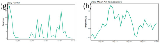 Time-series plots showing variation in environmental parameters during the monitoring period (May–June 2024). (a) Total dissolved solids (TDS, mg/L); (b) Electrical conductivity (EC, µS/cm); (c) Ammonia (mg/L); (d) Dissolved oxygen (DO, mg/L); (e) pH; (f) Water temperature (°C); (g) Daily rainfall (mm), with a subtle overlay highlighting rainfall periods; (h) Daily mean air temperature (°C).