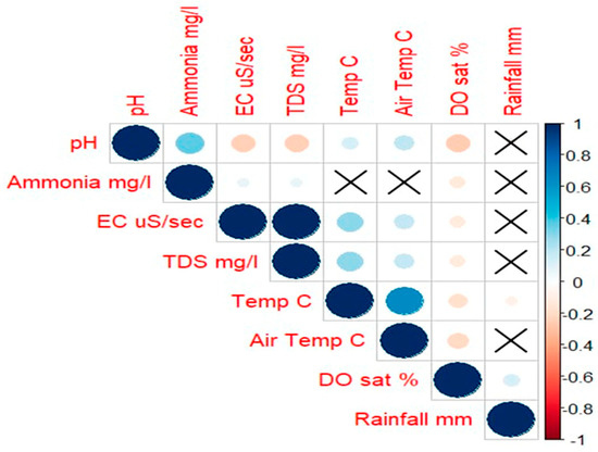 Correlations (Figure 8) show that there were strong positive correlations with EC and TDS (correlation coefficient = +1.00, p < 0.001) and air temperature with water temperature (correlation coefficient = +0.65, p < 0.001). There was a weaker correlation with pH and ammonia concentration (correlation coefficient = +0.36, p < 0.001). All other correlations had low likelihoods of having a relationship.