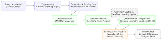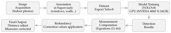The complete methodological framework can be divided into three principal modules: data preparation, detection and measurement, and redundancy correction. Each module contributes to the transformation of raw indoor images into quantitative spatial information. The overall pipeline is illustrated in Figure 1, which provides a system-level perspective connecting data collection, training, and measurement computation.