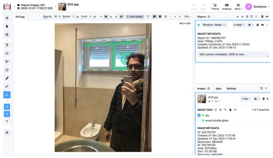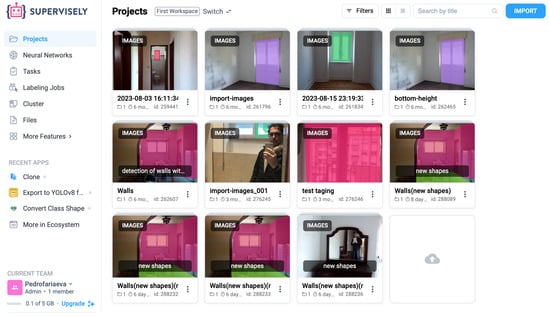 Object detection has become an almost commodity-level task in computer vision, with applications ranging from surveillance systems and autonomous driving to medical imaging and augmented reality [31,32,33]. This research begins with the detection of 204 images collected inside various apartments, focusing on the identification of windows, bottomHeight, and walls (Figure 1 and Figure 2). Only one of the photos included an explicit marker object. The dataset was collected through a custom application built in Node.js and deployed using Vercel [34] as the hosting service.