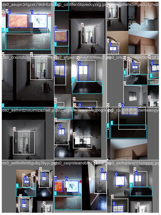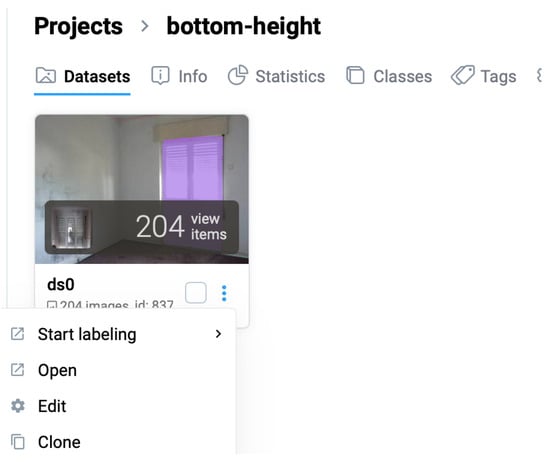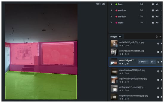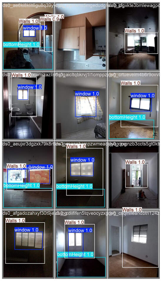 A total of 204 images of apartments were annotated using Supervisely, identifying three primary classes: windows, walls, and floors, along with markers and marker-like objects. The pre-training phase focused on classifying object categories without concern for subtypes (e.g., window material or glass thickness). The main objective was to extract measurable spatial information, with particular emphasis on estimating the bottomHeight of apartments, as this measurement enables further derivation of other dimensions [20,24,27] and (Figure 5).