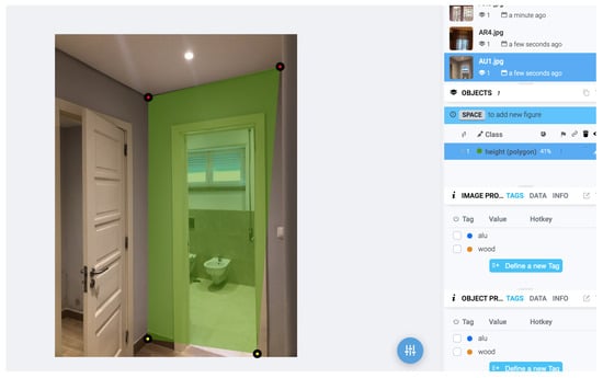 Supervisely offers an intuitive graphical interface for dataset annotation. Labels can be defined at the object level, though it does not support nested labels. While unnecessary for the current case study, fine-grained hierarchical labelling (e.g., distinguishing window subtypes) would be beneficial for future extensions: