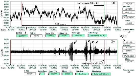 In case (a), the first change in the amplitude of the time series filtered with a low-pass filter occurs almost 4 h before the earthquake. At low frequencies, a change in pressure on the sensor is more noticeable. In case (b), the focus is on highlighting the seismic noise specific to rock breakage. This noise is observed when testing construction materials at the moment of breakage under controlled pressure.
