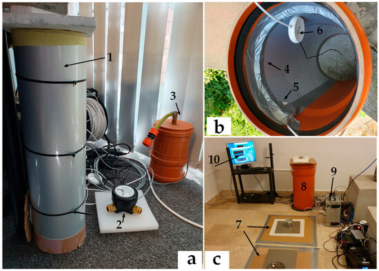 Test Emfit sensor: (a) (1) EMFIT sensor mounted externally on a vertical tube; (a) (2–3) infrasound equipment; (b) EMFIT sensor mounted internally; (c) horizontal installation.