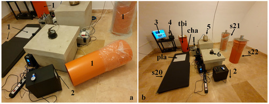 In Figure 4a, EMFIT sensors (1) were positioned both horizontally and vertically, with the audio speaker acting as the vibration source (2). The final configuration is shown in Figure 4b, where EMFIT sensors are marked according to the schematic (tbi = inner tube, cha = Chaparral, etc.). The vibration source (2) was oriented toward the floor, while environmental parameters (temperature, humidity, and pressure) were monitored by a weather station (4). An accelerometer and a seismometer, mounted on concrete pillars, are shown at positions (5) and (6), respectively. The ceiling of the test chamber has a semi-cylindrical shape with flat ends.