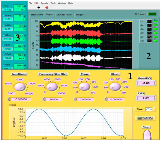 Experimental setup: (1) virtual signal generator; (2) data acquisition software; (3) meteorological monitoring station.