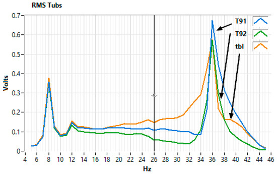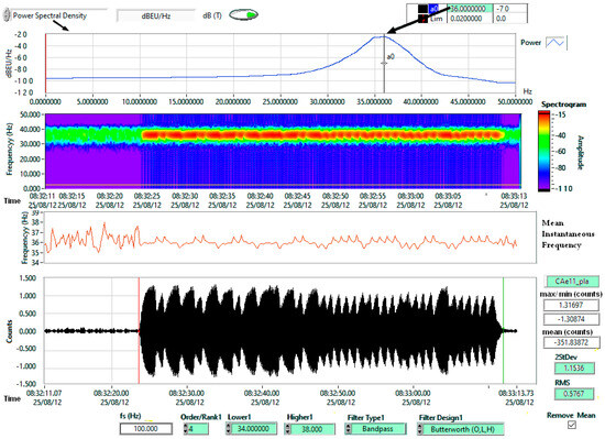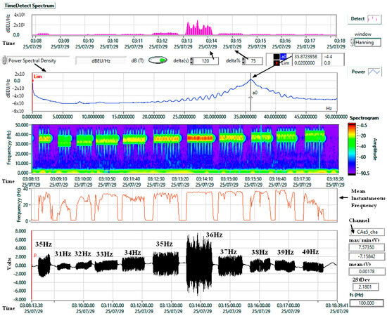 Figure 6 illustrates an example of a frequency response test for the 31–40 Hz range, although the experiments were performed from 5 to 45 Hz with 1 Hz increments. A clear maximum at 36 Hz is visible in both the Power Spectral Density (PSD) and the Short-Time Fourier Transform (STFT) spectrogram.