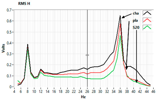 Figure 8 and Figure 9 provide a visual representation of the results. Figure 8 shows the frequency response of horizontally mounted EMFIT sensors (pla and s20, Figure 4b) in comparison with the Chaparral reference sensor (cha, Figure 3c and Figure 4b).