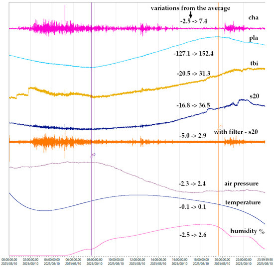 The tests were conducted using an infrasound sensor as a reference. To enable comparison and determine a transfer function, the same response area was selected, but differences remain, as shown in Figure 11 and Figure 12. In the NIEP network of infrasound sensors, the signal is captured from the air. The EMFIT sensor functions as an “ear” for detecting ground noise and is isolated from air vibrations by sound-absorbing materials. Old data from the NIEP database indicate that EMFIT sensors can be used, but the relevant research has been lost, if it ever existed. Comparing the old records with the new ones suggests that the sensors may not be of the same type, even if they share the same name.