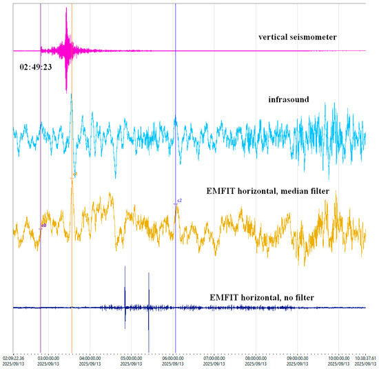 The filtered signal “s20” demonstrates a clear correlation with the Chaparral sensor, confirming environmental influence. Further, Figure 11 demonstrates the recording of Rayleigh waves from a distant earthquake in Kamchatka (epicentral distance > 7000 km), comparing seismometer, infrasound, and EMFIT signals.