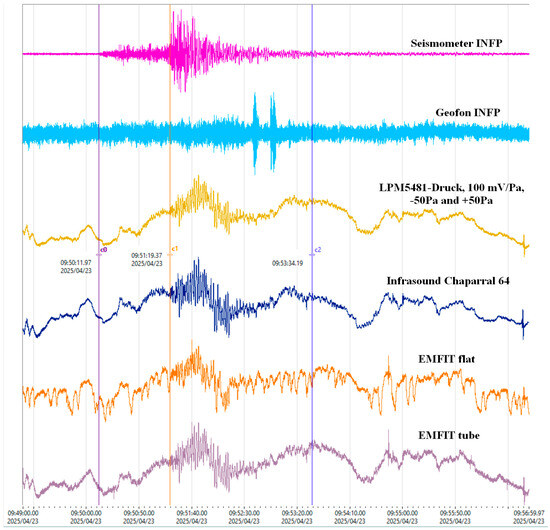 Figure 12 presents a 6.2 Mw earthquake in the Sea of Marmara (23 April 2025, 09:49 UTC), recorded by seismometers, geophones, infrasound sensors, and EMFIT sensors mounted both in tubes and flat on the ground (Figure 3a).
