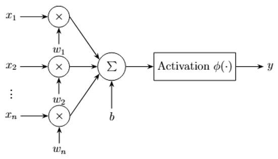 Artificial neurons, as used in ANNs simplify the biological mechanisms to enable efficient computation. Each neuron computes a weighted sum of its inputs and a bias followed by a non-linear activation function, such as Rectified Linear Unit (ReLU), sigmoid, or tanh [18]. This is illustrated in Figure 1.