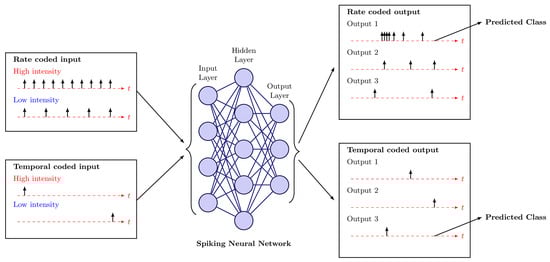 An example of input and output coding techniques is shown in Figure 3. In rate coding, high stimulus intensity is encoded as a high spike rate, whereas in temporal coding, higher intensity causes a neuron to fire earlier. At the output stage, a rate-coded classifier predicts the class with the highest firing rate, while a latency-coded classifier selects the class whose neuron fires first.