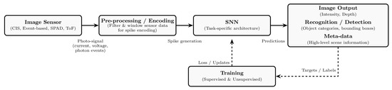 The process of handling sensor data using SNNs is illustrated in Figure 4. Raw sensor outputs are first pre-processed and subsequently encoded into spike trains that can be processed by the network. The SNN then generates an output prediction, which may have the form of an image, an inference result, or other high-level scene information.