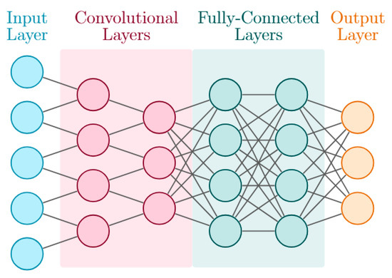 Schematic representation of a CNN architecture, consisting of an input layer, convolutional layers for feature extraction, fully connected layers for high-level reasoning, and an output layer for inference.