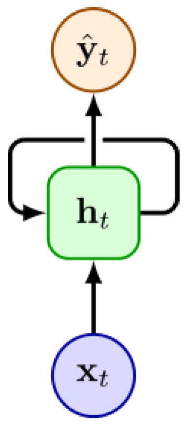 Illustration of an RNN unit, where the input is combined with the hidden state to predict an output , while the hidden state also feeds back into itself to capture temporal dependencies across time steps.
