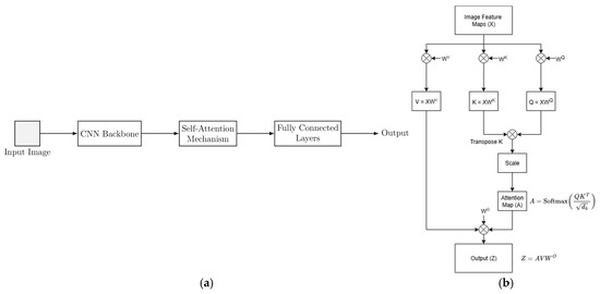 (a) High-level example of a hybrid transformer network combining convolutional backbones with an attention mechanism. (b) Vanilla self-attention mechanism: input features are projected into Queries (Q), Keys (K), and Values (V), and an attention map assigns higher weight to the most relevant features when combining the values.