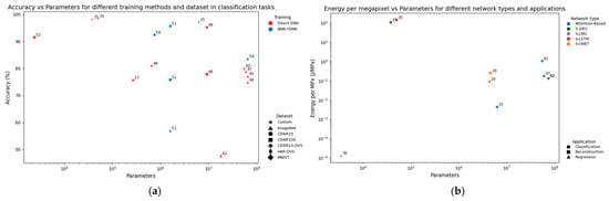 Evaluation metrics vary by task. Classification and recognition studies primarily report accuracy and F1-score, while detection tasks use mean Average Precision (mAP) and Intersection-over-Union (IoU). Tracking applications assess latency, FPS, and multi-object tracking accuracy. Image reconstruction relies on Peak Signal-to-Noise Ratio (PSNR) and Structural Similarity Index Measure (SSIM). Hardware-oriented studies additionally report energy per inference, latency, parameters, and, rarely, model size.
