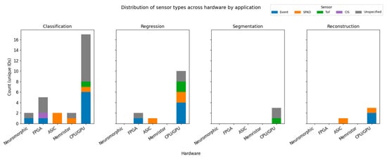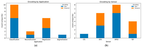 The most widely used are event-based sensors, which include DVSs and spike cameras. These devices asynchronously report changes in pixel intensity, providing high temporal resolution and low-latency outputs that align naturally with the event-driven computation of SNNs [24,25,26,27,28,29,30,31,32,33,34,35]. The second group comprises ToF sensors, including Light Detection and Ranging (LiDAR), which output 2D spatial images with depth encoded as a third dimension [36,37,38,39]. The third group includes SPAD arrays, which can detect single photon arrivals, making them highly effective in low-light and time-resolved imaging scenarios [40,41,42,43,44,45]. The final group consists of CMOS Image Sensors (CISs), which produce frame-based or frame-like outputs. In the reviewed works, these are typically used in studies where frame-based imagery is converted into spike trains through pre-processing and encoding steps, enabling compatibility with SNNs [46].
