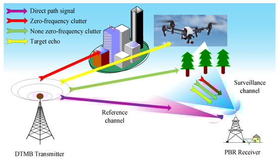 As a special form of bistatic radar, passive bistatic radar has many advantages over the traditional radar. With no cooperative transmitter, PBR works silently but using the existing broadcasters as radar sources for target detection, location and tracking [1,2]. Due to the silent and bistatic work pattern, PBR is not easily attacked by the anti-radiation missile or disturbed by the hostile radar jammer. In addition, the low-frequency band and the low-altitude coverage characteristic of the broadcasters make the system capable of stealth and low-altitude target detection. The commonly used broadcasters include Frequency Modulation (FM) [3,4,5], Analog Television (ATV) [6,7], Digital Audio Broadcast (DAB) [8,9], Digital Terrestrial Multimedia Broadcast (DTMB) [10,11] and so on. The development trend of the illuminator of broadcaster is from narrowband to broadband.
