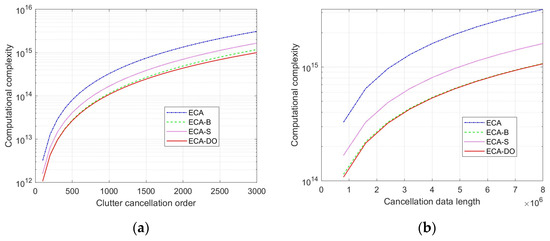 Next, the computational complexity of the four clutter cancellation algorithms under different scenarios is analyzed, supposing that the system sampling rate and the extended clutter cancellation order are set to 8 MHz and 20, respectively. In this part, the integration time varies from 0.1 s to 1 s, and the clutter cancellation order increases from 1000 to 3000. Corresponding to analysis, R is fixed at 20. K varies from 100 to 3000 and N increases from 8 × 105 to 8 × 106. Figure 4 shows the comparison results of the computational complexity of different algorithms for fixed clutter cancellation order and cancellation data length, respectively.