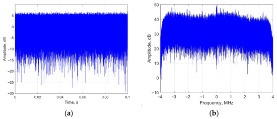 In this section, DTMB signal is adopted as the radar source in the simulation. DTMB signal adopts Quadrature Amplitude Modulation (QAM) and Time-Domain Synchronous Orthogonal Frequency Division Multiplexing (TDS-OFDM) as its modulation and multiple access method. The bandwidth of DTMB signal is 7.56 MHz, and the sampling rate of the PBR system is 8 MHz. The total integration time is 0.1 s. The waveform and the spectrum of the DTMB signal are shown in Figure 5.