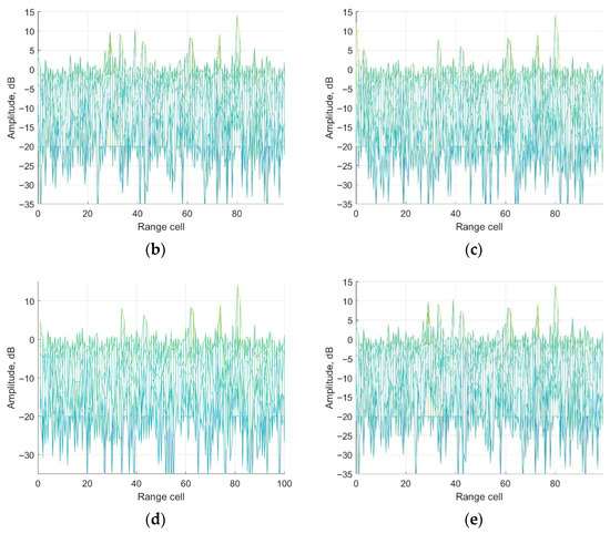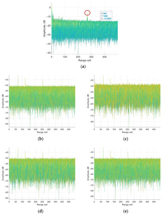 Range-Doppler results in range dimension: (a) without cancellation; (b) ECA method; (c) ECA-B method; (d) ECA-S method; (e) ECA-DO method.