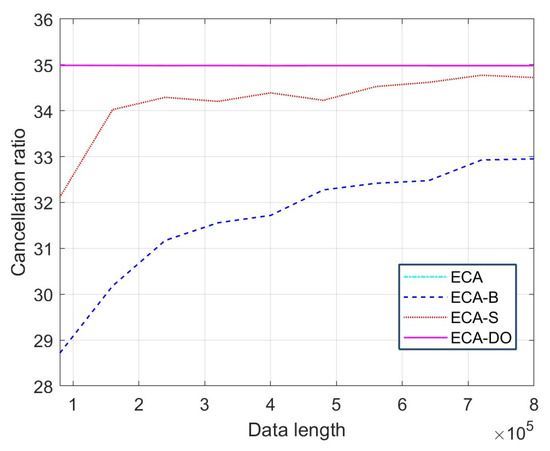 From Figure 7, it could be seen that the platform of the four results is −51 dB, −49 dB, −50 dB and −51 dB. It could be calculated that the cancellation ratios of the four methods are 35 dB, 32 dB, 34 dB and 35 dB, respectively. The main reason is that the ECA methods are based on the principle of total LS for clutter estimation, whereas the estimation performance of the ECA-B and ECA-S methods in each segment are worse than that of the total cancellation, such as in the ECA and ECA-DO methods. Figure 8 shows the relationship between the data length and cancellation ratio of the three methods.