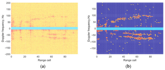 Result on real data with 100 frames using ECA-DO method: (a) Range-Doppler result; (b) CFAR result.