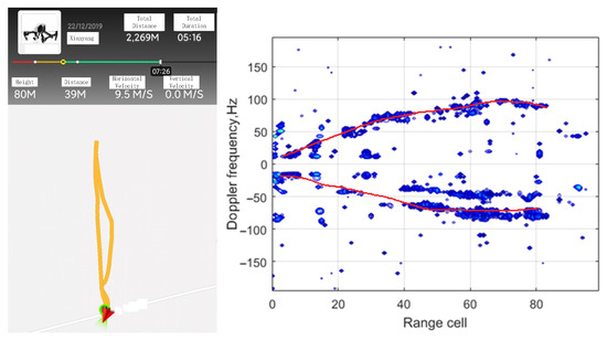 To further examine the proposed ECA-DO method, 100 frames of continuous real data are employed. Range-Doppler results and constant false alarm rate (CFAR) detection results obtained by using the ECA-DO method are shown in Figure 12. In CFAR processing, cell-averaging CFAR (CA-CFAR) detection method is adopted to extract the parameter of the moving target. The CFAR detection threshold is set to 3.5. From Figure 12, it could be seen that several target motion trajectories, including UAV, are detected. As shown in Figure 13, the extracted point results are consistent with the UAV motion trajectory results displayed on UAV control device, which verifies the cancellation performance of the proposed ECA-DO method.