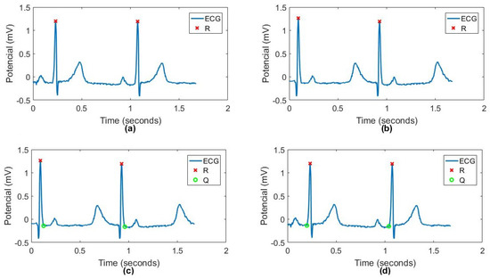 Example of a four-stage algorithm for Q peak detection. (a) Stage 1—Original ECG Signal with detected R peaks; (b) Stage 2—Mirrod ECG Signal, Stage 1 signal mirrod; (c) Stage 3—Mirrod ECG Signal with detected Q peaks; (d) Stage 4—Original ECG Signal with detected Q peaks, Stage 3 mirrod.